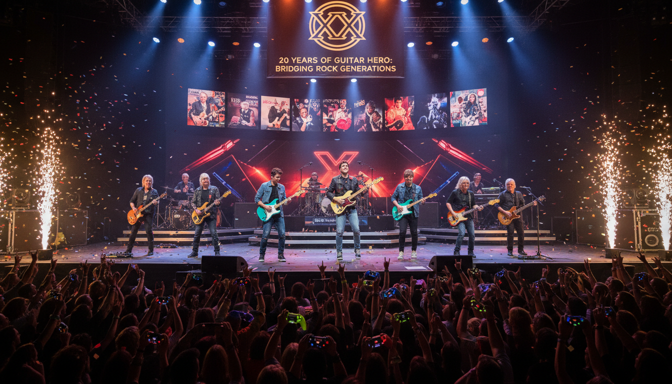 احتفل لعبة جuitar Hero بالذكرى العشرين لإطلاقها كواحدة من الألعاب التحولية التي أتاحت للاعبين تجربة إثارة أن يكونوا نجوماً في عالم الروك من منازلهم. تم تطوير اللعبة بواسطة Harmonix ونشرتها في البداية RedOctane. لقد أعادت هذه اللعبة إحياء الاهتمام بالفرق الروك الكلاسيكية، مقدمة إياها لجماهير جديدة وتعزيز تقدير الموسيقى عبر الأجيال.